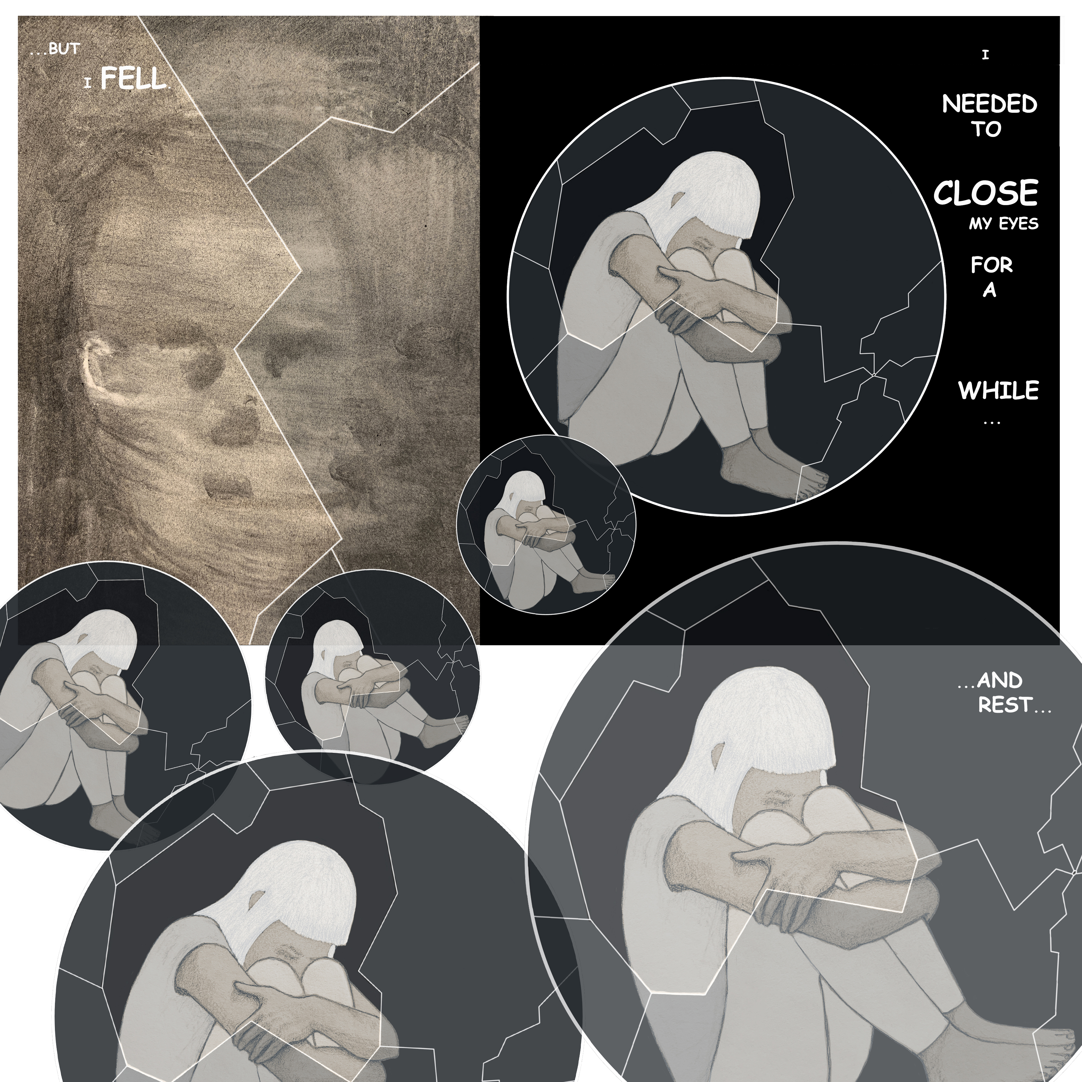 Here are the prompts “collide”, “moon”, and “loop”. The drawing for the first panel was an exercise I did for college. I have adapted it for the comic.